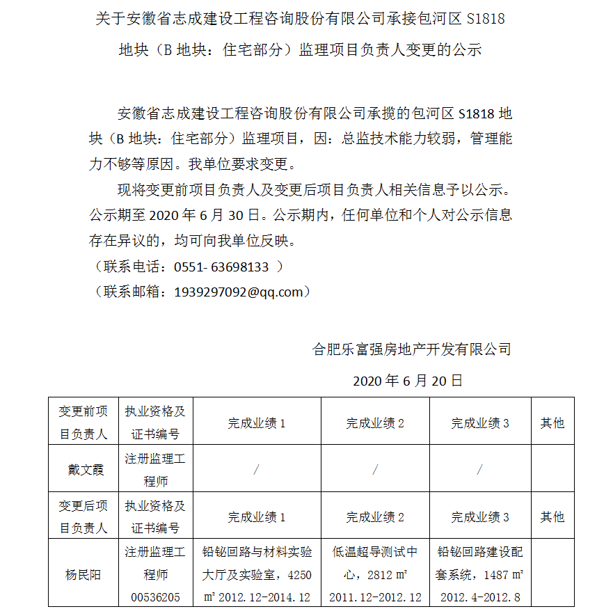 安徽省志成建設工程咨詢股份有限公司承接包河S1818地塊監理項目負責人變更公示