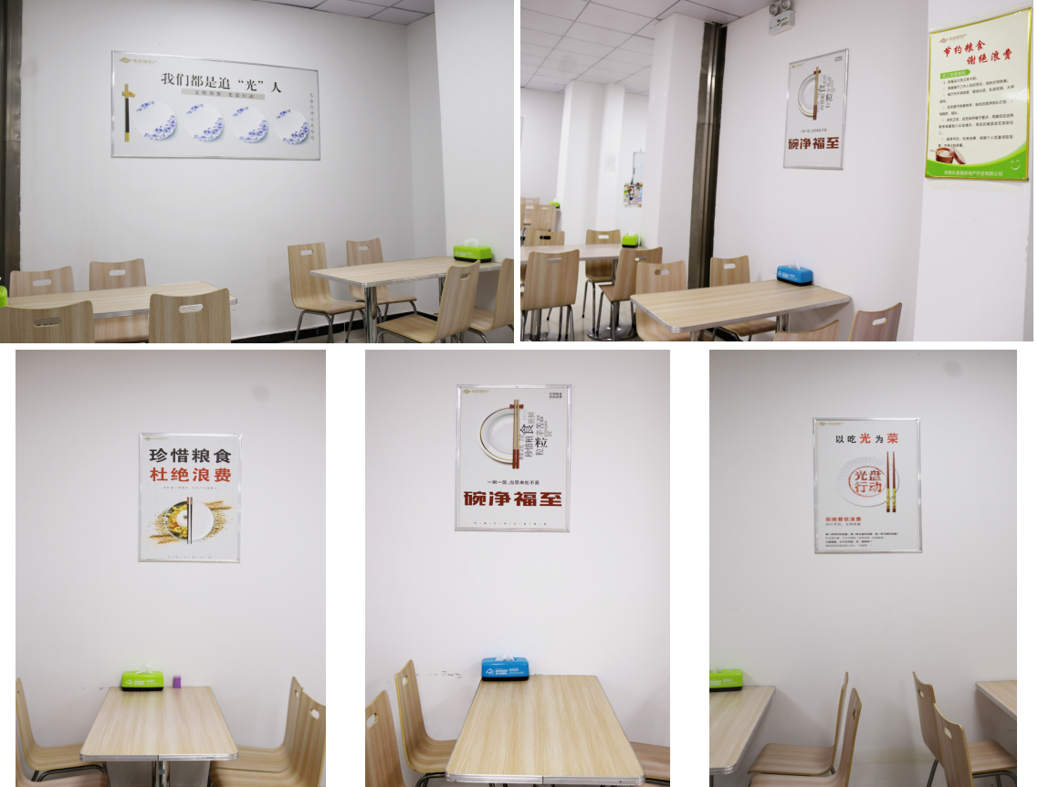 食堂在醒目位置張貼擺放宣傳標識,一進食堂就看到墻上的‘光盤行動’標語,積極營造浪費可恥、節約為榮的氛圍,時刻提醒員工用餐按需、合理取餐。