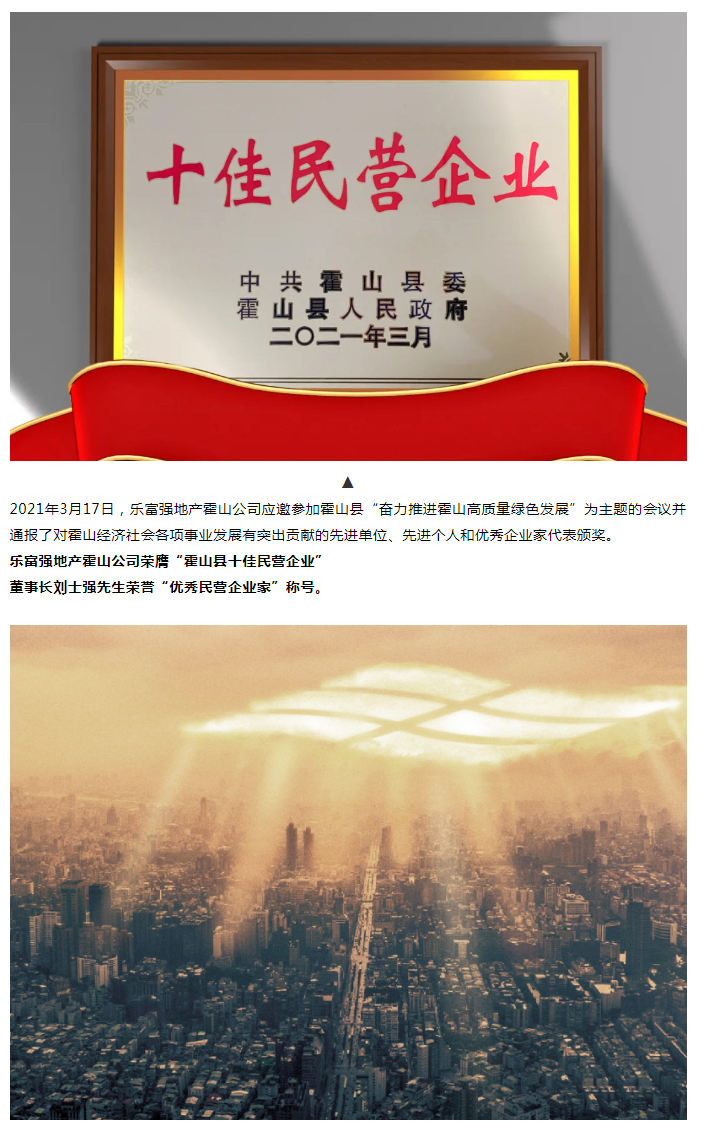 喜報(bào)|樂富強(qiáng)地產(chǎn)霍山公司榮膺“霍山縣十佳民營企業(yè)”